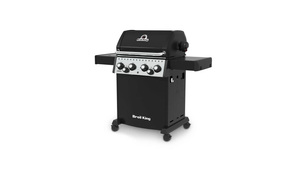 The new Broil King Crown 480 is the ideal appliance for those of you who want to do all of your cooking outdoors. This 4 burner BBQ has a good size cooking area and with the Dual Stainless Steel burners, it offers a very even heat coverage across the entire grill. The Crown 480 also comes with a handy hob burner located on the left hand side shelf, as well as a rear rotisserie burner and mains powered rotisserie kit to give you the complete outdoor cooking experience. The stainless steel Flave-R-Wave cooking system gives those classic cooking results, vaporizing the juices which infuses back into your food for great flavor. With its high heated painted steel cookbox, black powder coated side shelves, frame and front panel the Broil King Crown 480 is a welcome guest to any BBQ session.