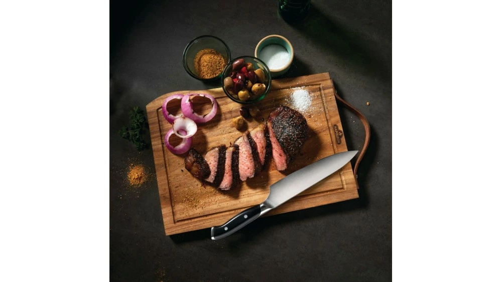 Napoleon Presdients Limited Edition Design. Acacia Wood Cutting Board with genuine leather handle and grooved edges . Set also includes a Napoleon Executive Chef Knife.