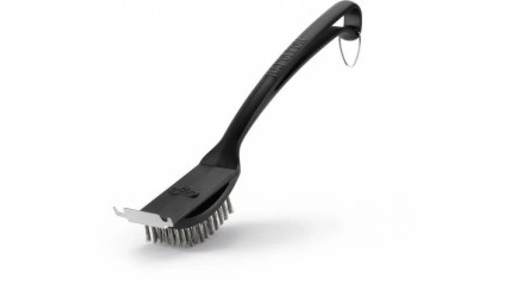The stainless steel brush has a black handle that has a hook for easy storage. A must have accessories for stainless steel grills.